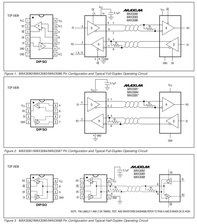 All devices have a 1/8-unit-load receiver input impedance that allows up to 256 transceivers on the bus. The MAX3082/MAX3085/MAX3088 are intended for half-duplex communications, while the MAX3080/MAX3081/MAX3083/MAX3084/MAX3086/MAX3087 are intended for full-duplex communications. The MAX3089 is selectable between half-duplex and full-duplex operation. It
