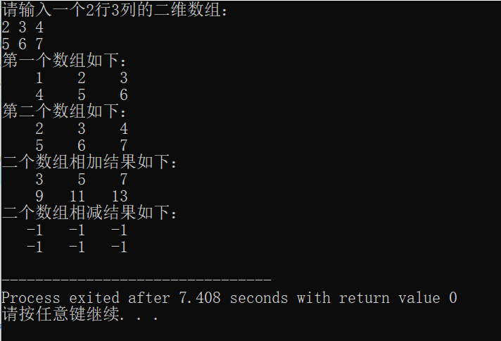 2.编写一个程序,用成员函数重载运算符“+”,友元函数重载运算符“-”,完成两个二维数组 (两行三列的二维数组)相加、相减。要求第一个二维数组有构造函数设置,另一个二维数组的值由键盘输入。