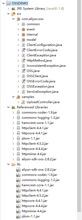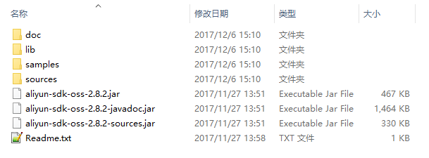 我下载的是最新版本的2.8.2 sources文件夹是oss源码, samples文件夹是oss各种调用的测试demo, lib文件夹是支持jar包