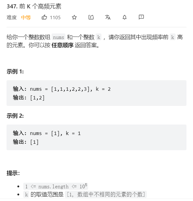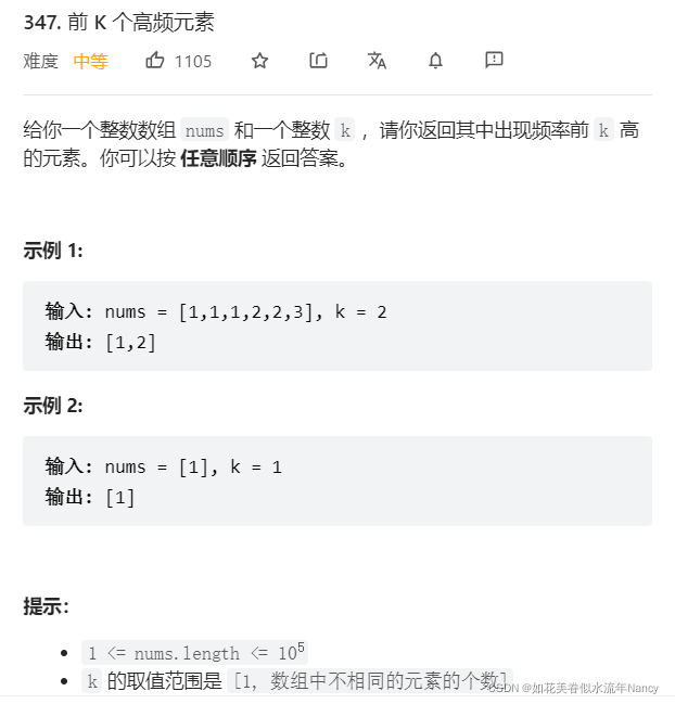 };方法二:哈希表+桶排序,划分成 (n+1) 个桶(0-n),n为nums.size( ),即最极端的情况,所以元素都相同,那么数量为n。然后从桶中倒序输出K个。