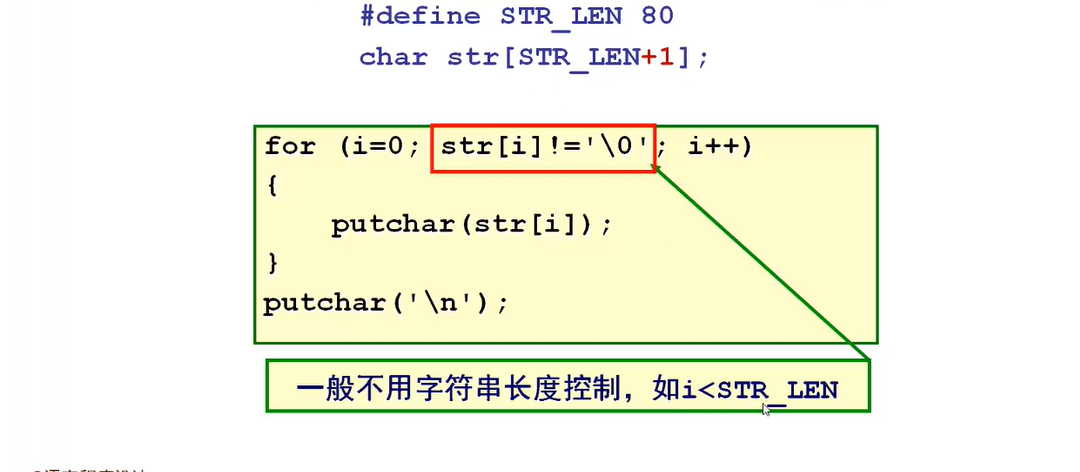 在定义一个字符数组时, 一定要保证数组的长度比实际字符个数多一个字符, 这是因为C语言规定字符串都是以空字符结尾的, 即必须留出一个单元来存放字符串结束标志, 否则可能会导致程序出现不可预期的结果. 定义一个长度为STR_LEN的字符数组, 并不意味着这个数组总是包含一个长度为STR_LEN-1的字符串, 实际上字符串的长度取决于空字符的位置, 而不是字符数组的长度. 我们要将字符串中的内容逐个输出时, 可以像下面的程序这样处理: 每次循环都输出一个字符, 直到当前字符为空字符为止. 值得注意的是, 我们并不用 i < STR_LEN这个条件作为循环继续的条件, 这是由于长度为STR_LEN的字符数组并不一定包含一个长度为STR_LEN-1的字符串. 显然, 用计数变量 i的值与STR_LEN作比较显然是不明智的.