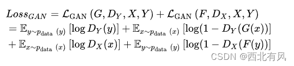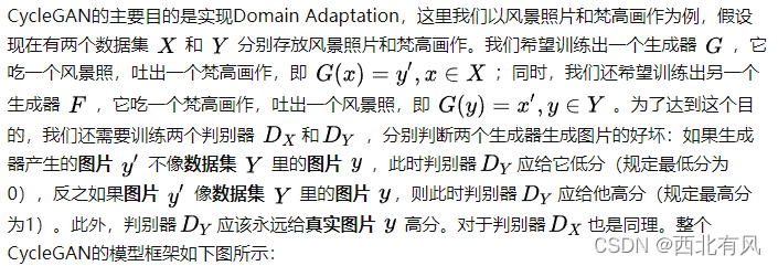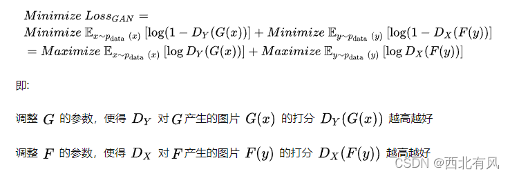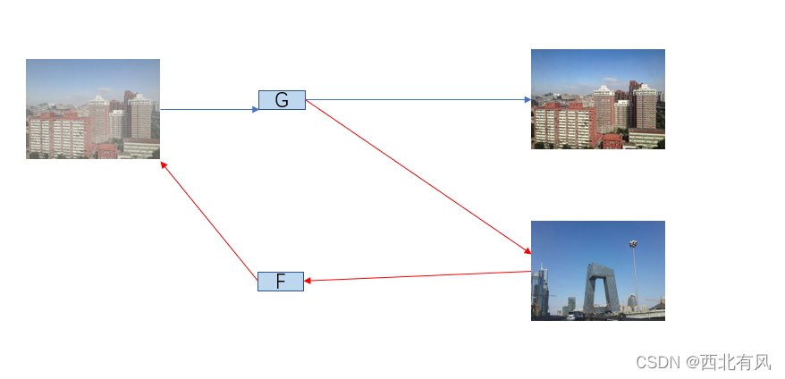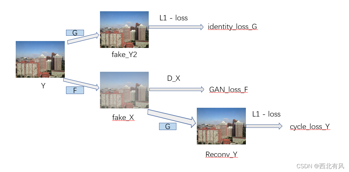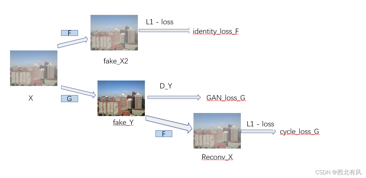 这是一开始GAN被提出时的思想,而在CycleGAN中,我们不仅想要生成器产生的图片y'跟数据集Y中的图片画风一样,我们还希望生成器产生的y'图片跟他的输入图片x 内容一样(比如我们输入一张带房子的照片,我们希望产生梵高画风的房子图片,而不是其他内容的图片,比如向日葵、星夜等等,否则意义就不是很大了。因为在一些APP中,我们通常想把自己拍摄的照片变成梵高画作嘛~)。