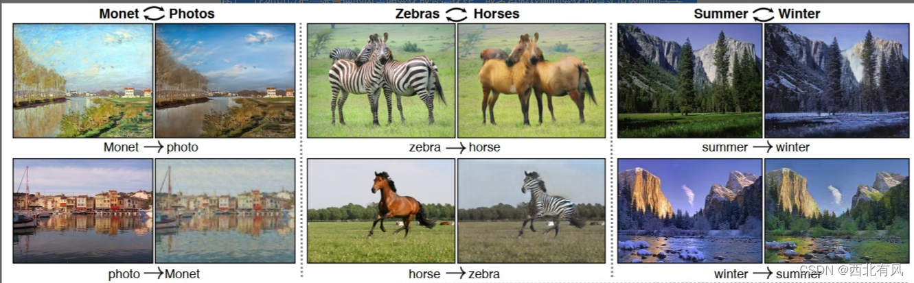 CycleGAN的一个重要应用领域是Domain Adaptation(域迁移:可以通俗的理解为画风迁移),比如可以把一张普通的风景照变化成梵高化作,或者将游戏画面变化成真实世界画面等等。以下是原论文中给出的一些应用:
