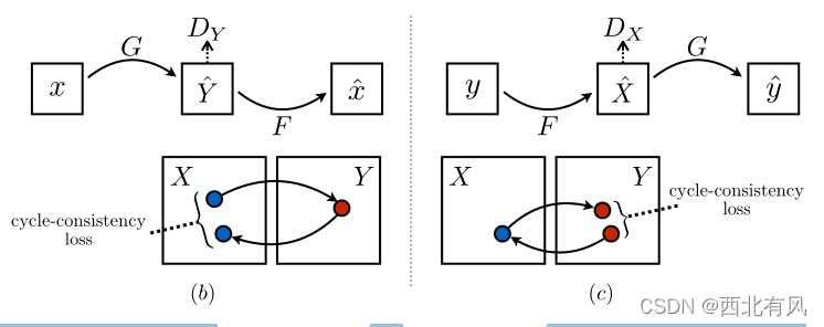 有了这样的约束,我们才能希望生成器将我们的输入照片的风格转化为梵高画风,而不是从梵高的作品中随便挑一张图片来应付我们了事。Cycle Consistency Loss在原论文中的插图解释为