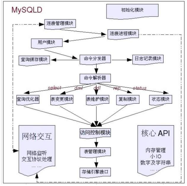 然后到用户模块检查连接是否有权限访问,然后再到命令分发器,首先到查询缓存模块检查是否有缓存,如果有缓存则到日志记录模块记录日志直接返回,否则到日志记录模块记录日志再到命令解析器,进行解析不同的请求分发到不同模块。
