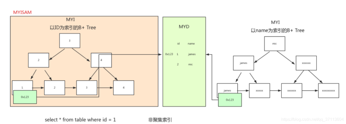 MyISAM:允许没有任何索引和主键的表存在,索引都是保存行的地址。