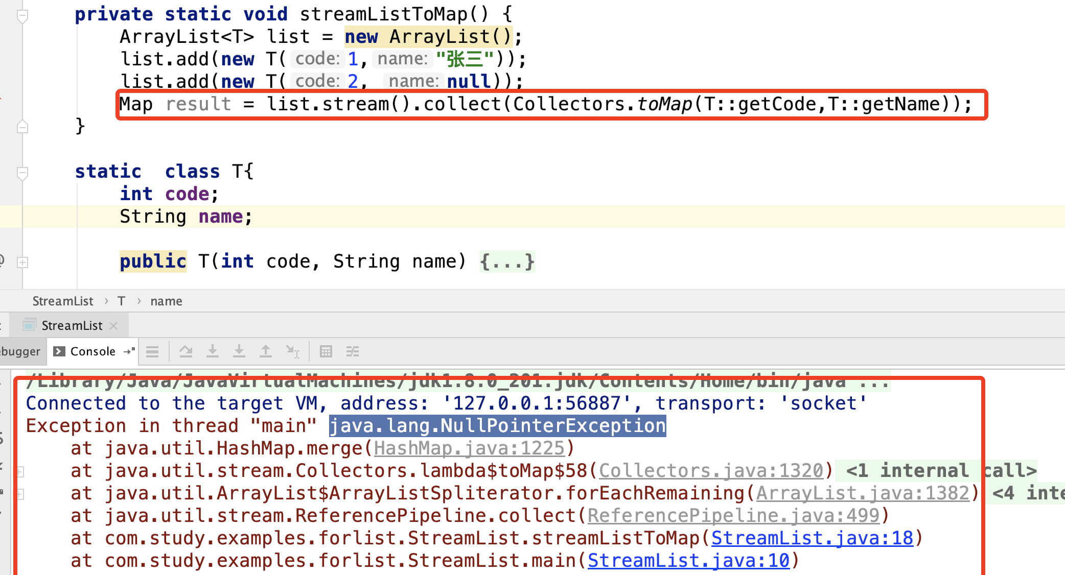list通过stream转map报错如下图所示,在做组装map的时候报错了。原因就是因为组装的键值对有为null的原因,虽然hashmap允许key和value都为null。版权声明:本文为jiang_zf原创文章,遵循CC 4.0 BY-SA版权协议,转载请附上原文出处链接和本声明。原文链接:https://blog.csdn.net/jiang_zf/article/details/106912273