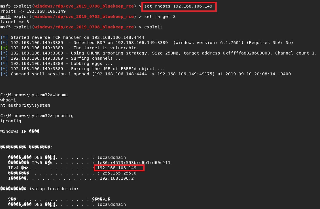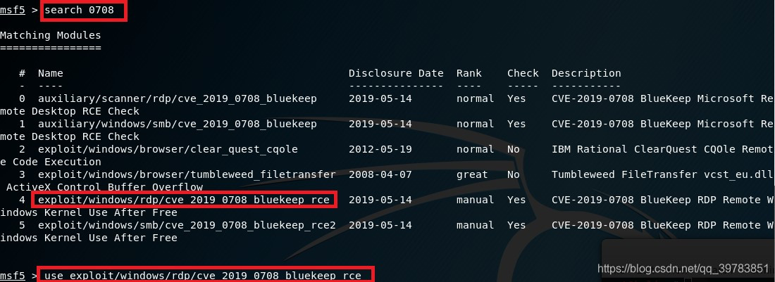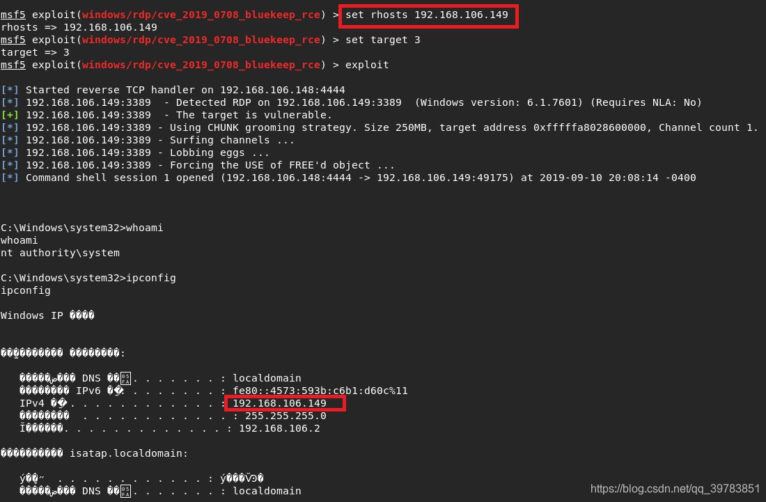 如提示Exploit failed: NameError undefined local variable or method `rdp_connect' for,则需要替换下载的exp(4个rb文件);