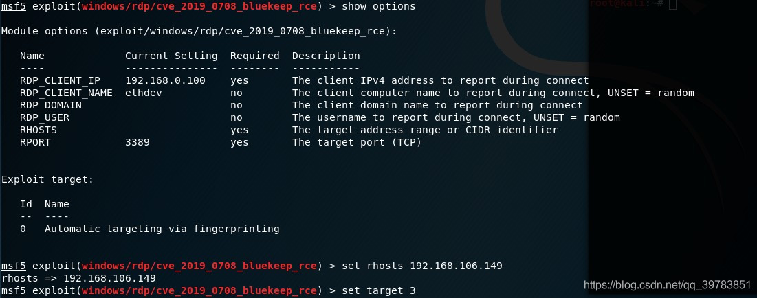 这里只需要设置两项,set rhosts 目标ip(我这里是192.168.106.149),以及set target 3