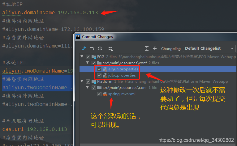4、以下文件比如绑定自己ip,这种为了自己能访问项目,不需要提交。但是在提交的时候总是跳出来,每次都要去掉勾选,觉得很烦,因为我们根本不需要提交这些文件。如下图