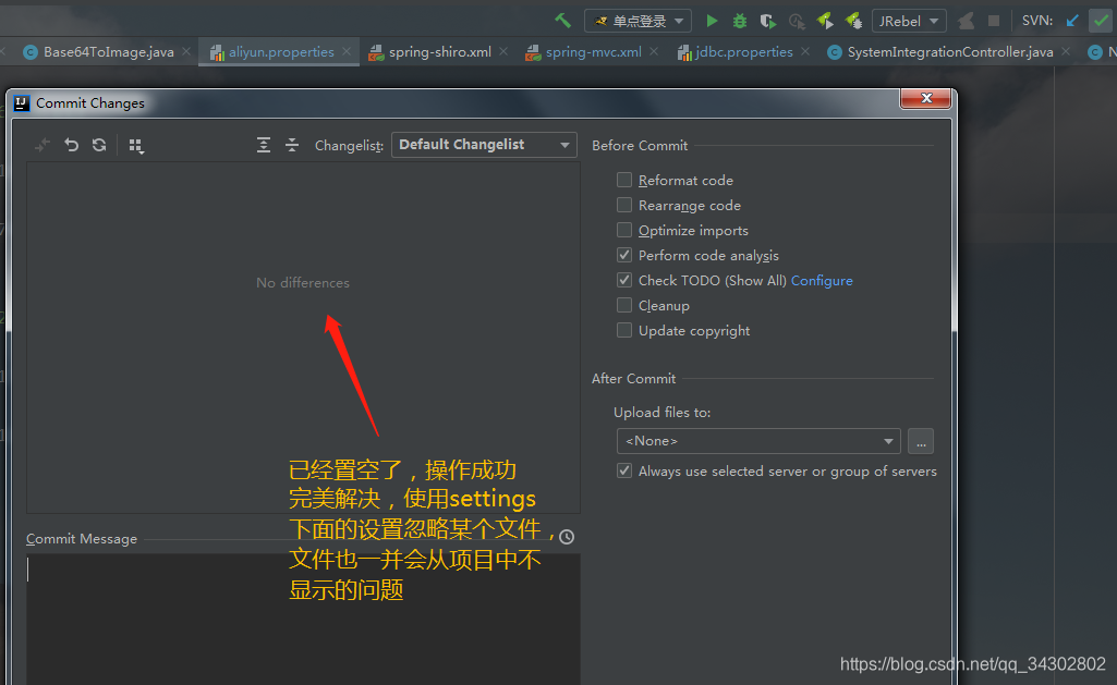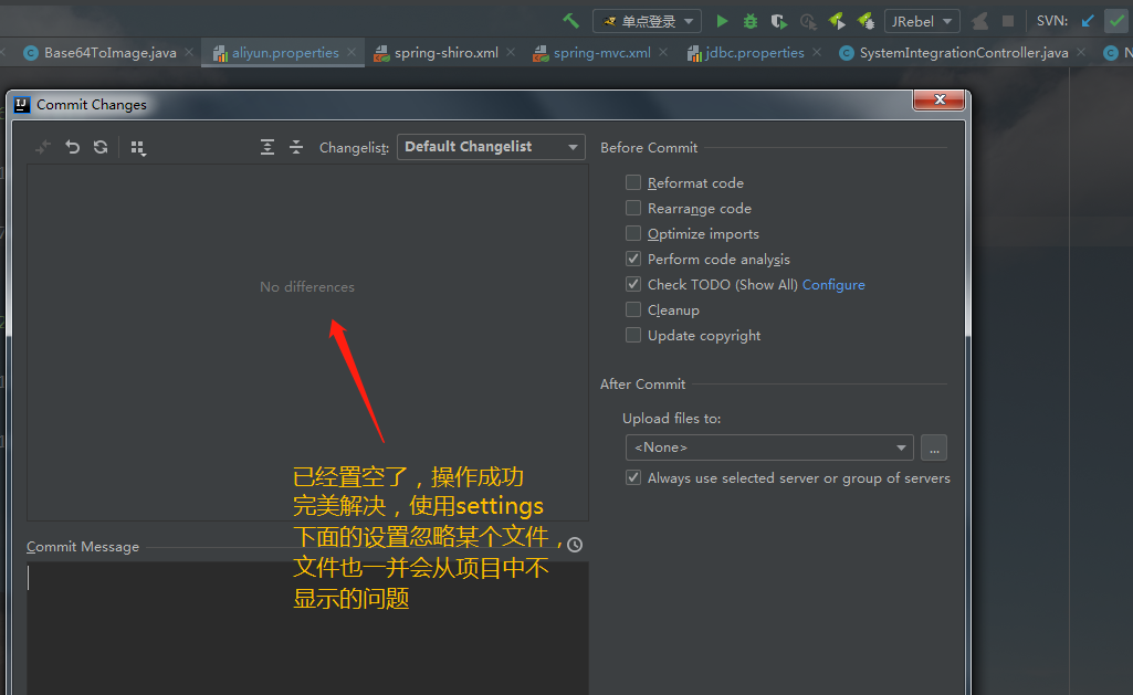 8、点图片右上角√按钮,提交文件,查看不想提交的文件是否还在,默认选择Default Changelist这个文件夹,上图Default Changelist下文件已经都被拖至新建的文件夹中,此时并无文件