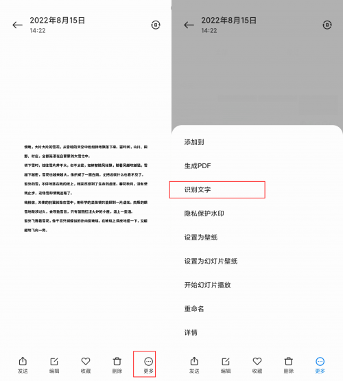 第一步:打开手机相册,找到需要提取文字的图片,然后点击【更多】按钮,找到【识别文字】功能,单击一下。