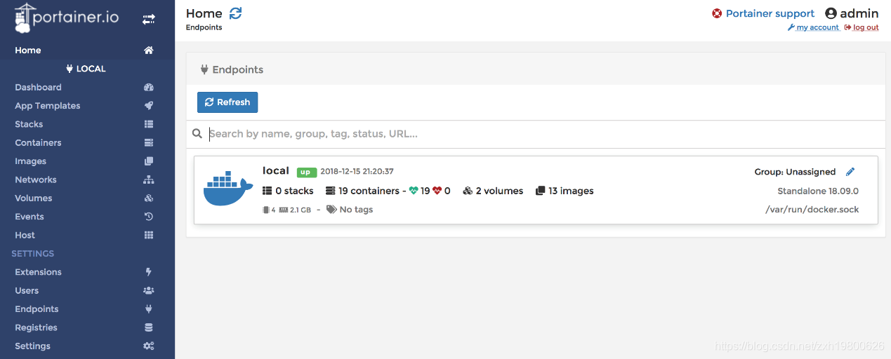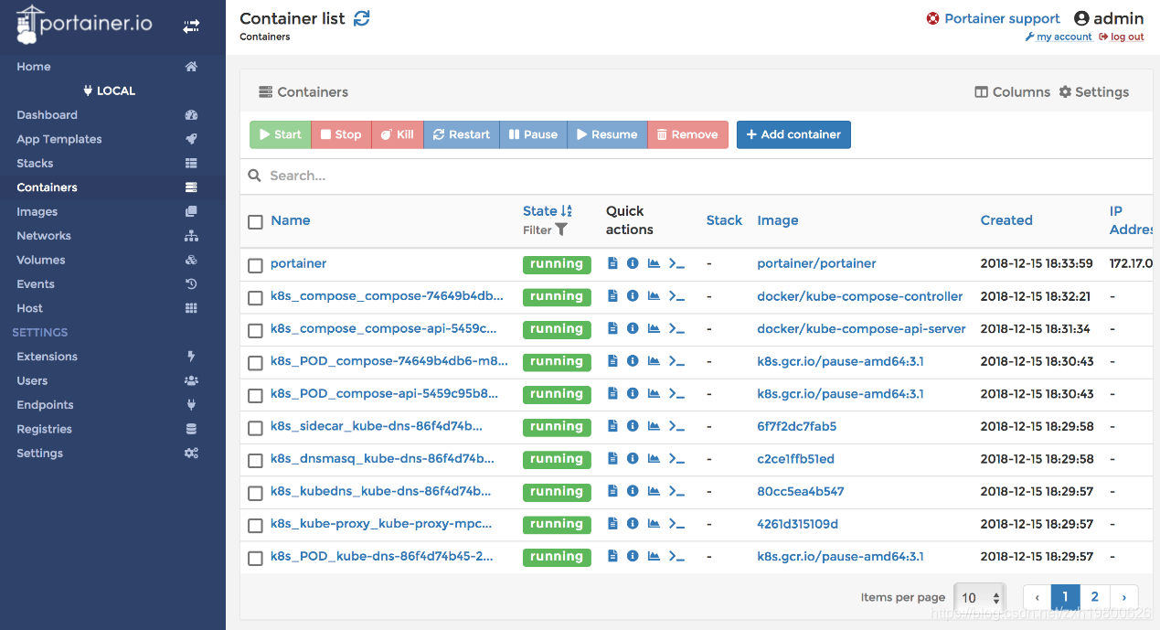 上图为登陆成功之后的界面,可以在containers菜单下查看所有的容器列表,可以在images菜单下查看所有的本地镜像列表,其他的详细操作可以参考官方文档。