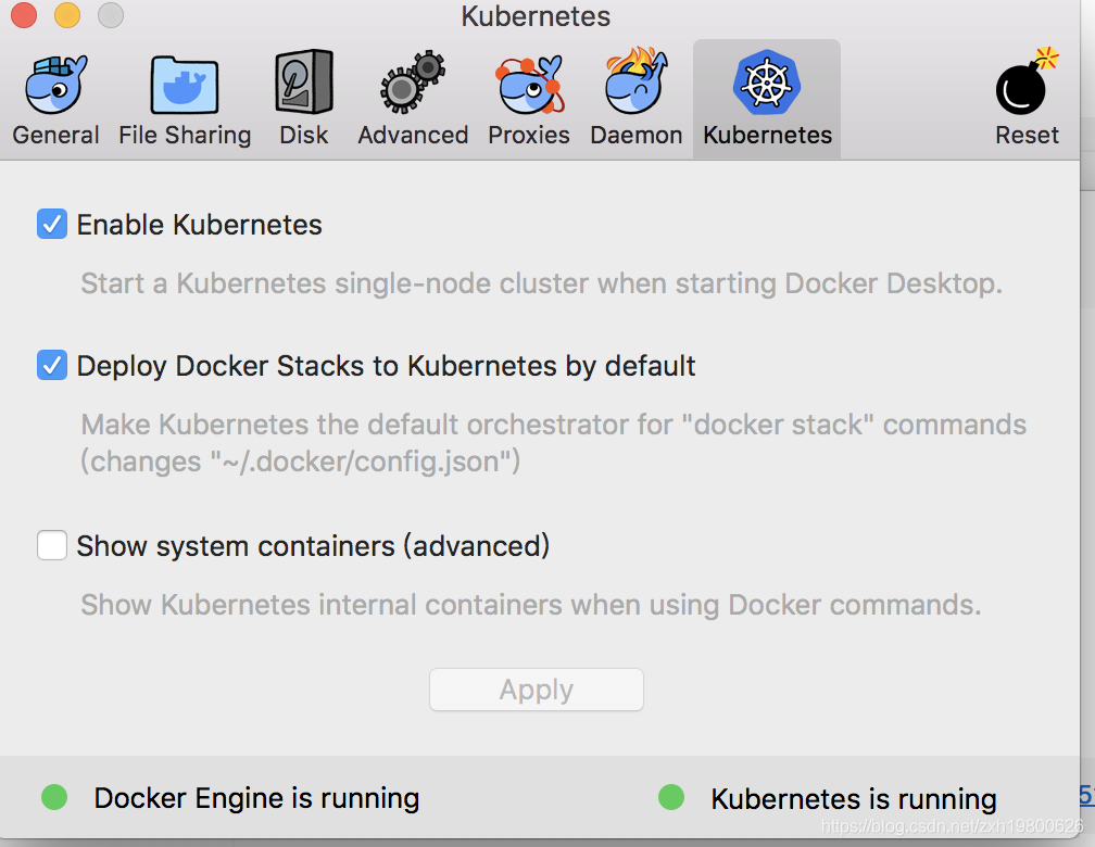 点击 “apply” 就开始安装kubernetes.等右下角“kubernetes staring” 变绿色“kubernetes is running”,就表示安装完成。