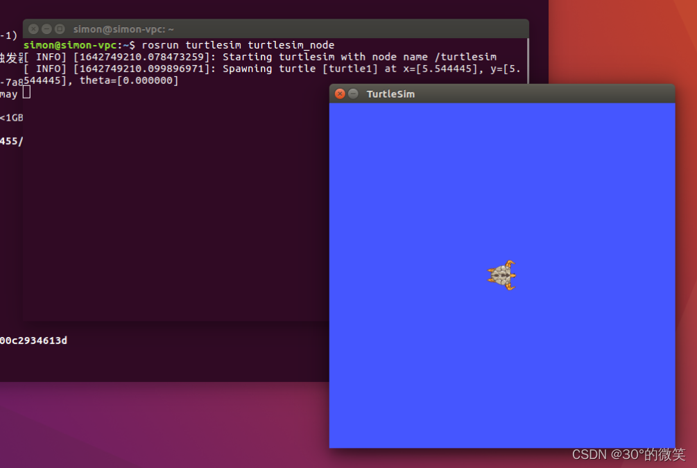 接着我们测试ROS的吉祥物--小海龟,来简单的测试ROS运行是否正常,同时也来体验一下 ROS的神奇与精彩! 启动roscore后,重新打开一个终端窗口,输入: