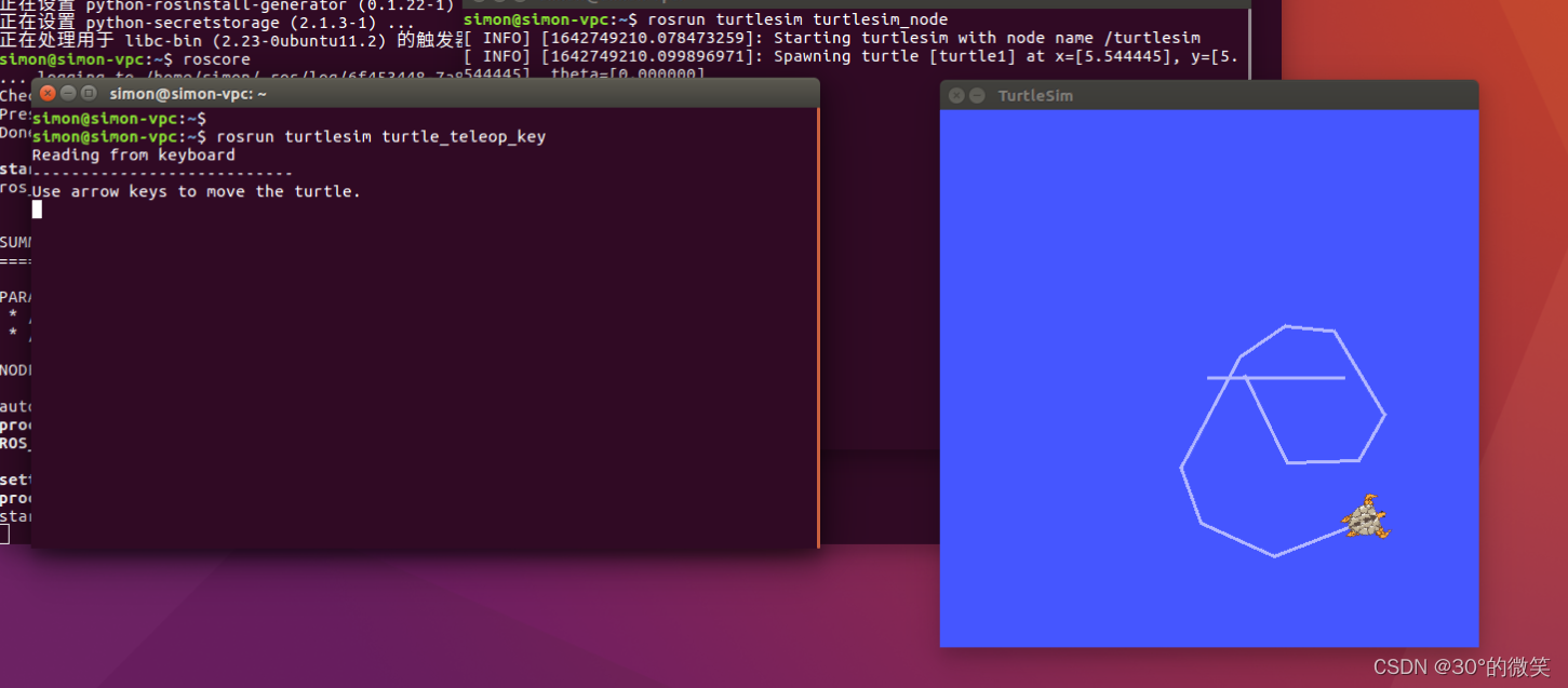 将鼠标聚焦在第三个终端窗口上,然后通过键盘上的方向键,进行操作小海龟,如果小海龟 正常移动,并且在屏幕上留下自己的移动轨迹,如下图。恭喜你,ROS已经成功的安装、配 置并且运行!