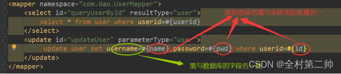 <select id="queryById" resultType="user"> select userid as id, username as name, password from mybatis.user where userid = #{id} </select>3)结果集映射ResultMap(推荐使用)