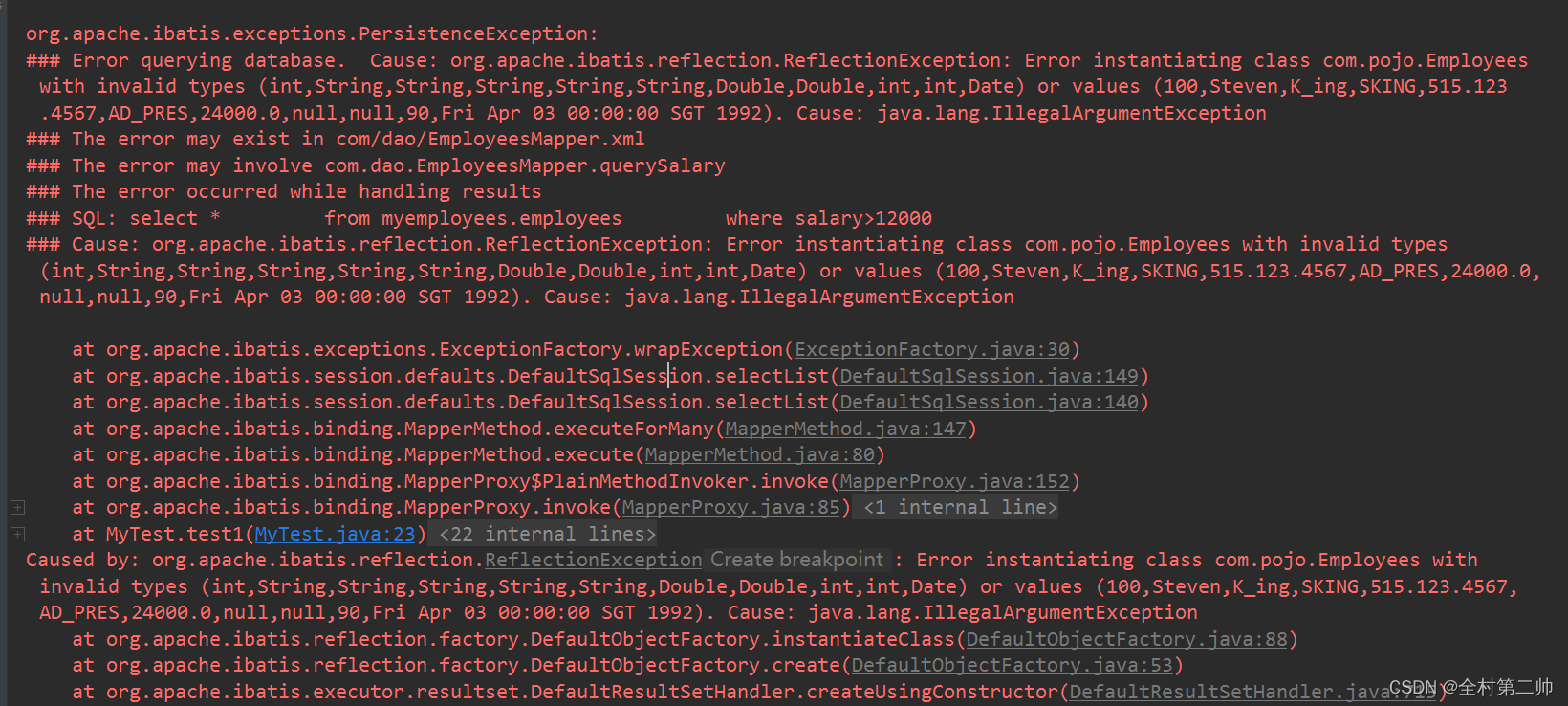 ### Error querying database. Cause: org.apache.ibatis.reflection.ReflectionException: Error instantiating class com.pojo.Employees with invalid types (int,String,String,String,String,String,Double,Double,int,int,Date) or values (100,Steven,K_ing,SKING,515.123.4567,AD_PRES,24000.0,null,null,90,Fri Apr 03 00:00:00 SGT 1992). Cause: java.lang.IllegalArgumentException