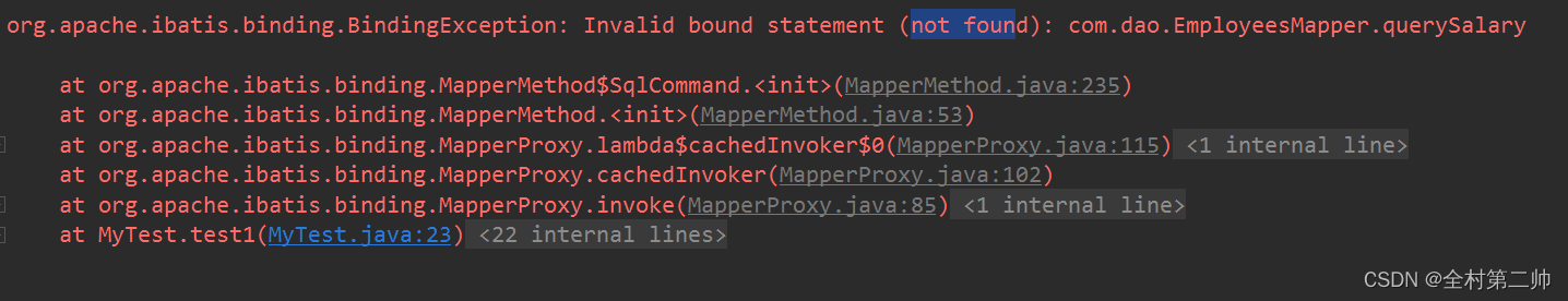 解决方案:在使用<package name="包名"/>或者<mapper class="接口名"/>时,映射文件名必须和接口名一样,否者报错。使用<mapper resource=""/>时,两者不同名不会报错。