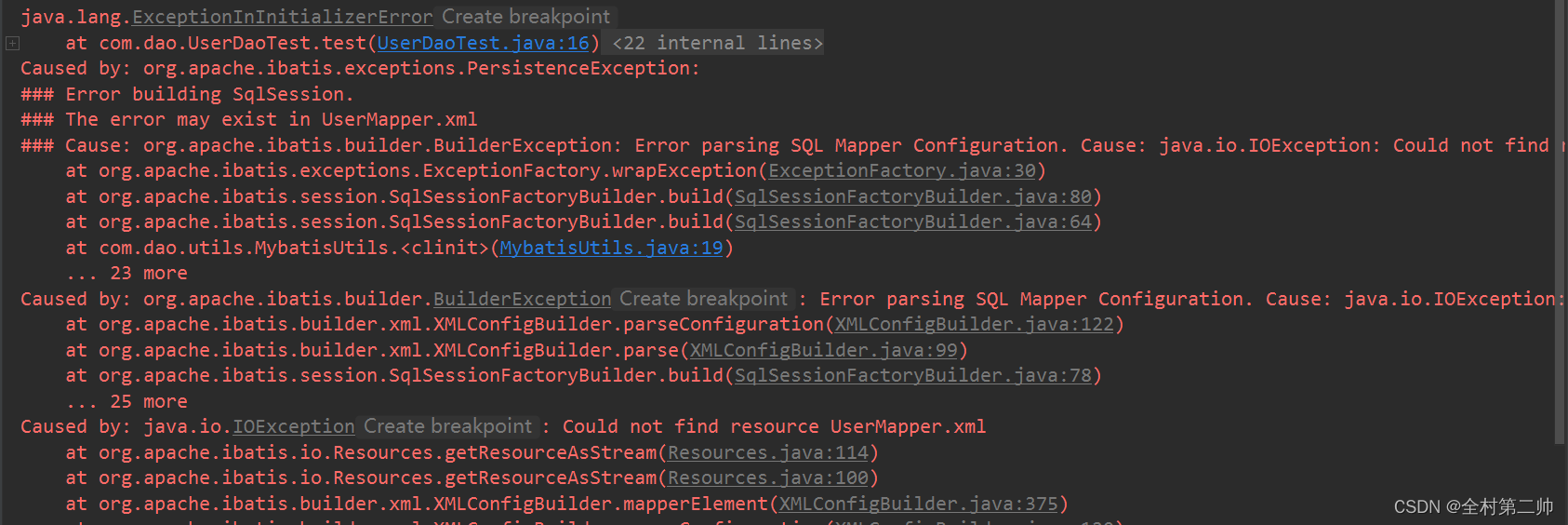 1、java.lang.ExceptionInInitializerError....The error may exist in UserMapper.xml