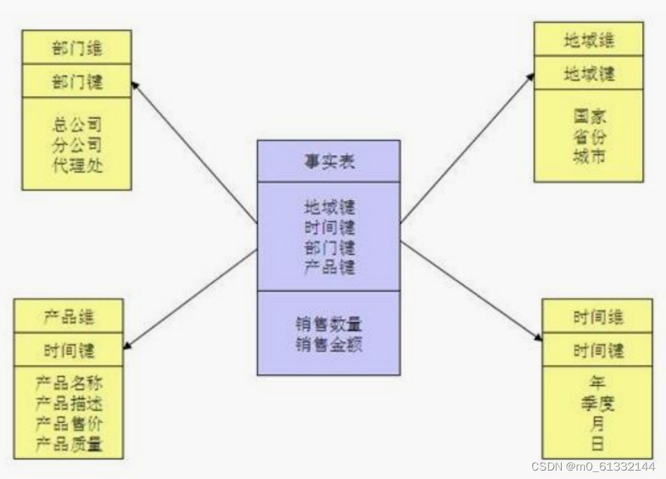 星型模型就是一张事实表,以及零个或多个维度表;事实表与维度表通过主键外键相关联,维度表之间没有关联,就像很多星星围绕在一个恒星周围,故取名为星形模型。