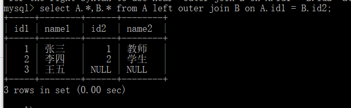 select A.*,B.* from A left outer join B on A.id1 = B.id2;结果:查出的结果为,着重参考于左边的表。