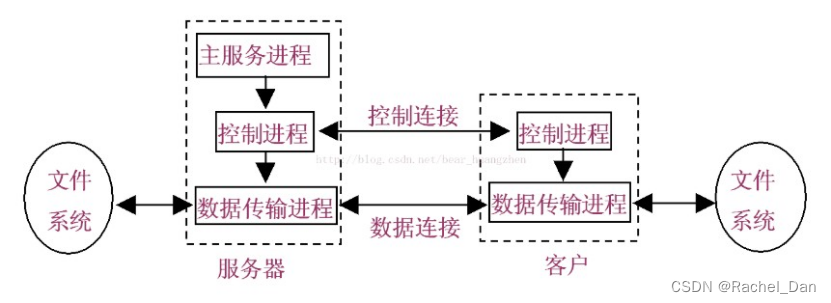 基本构成:服务器端&客户端交互。FTP传输流程:客户端程序先和服务器建立连接,再向服务器发送一些常用的操作请求,服务器给予响应并执行相关操作。