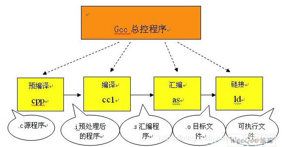 3.连接阶段,将上一步成生的各个目标文件,根据一些参数,连接生成最终的可执行文件,主要的工作就是重定位各个目标文件的函数,变量等,相当于将个目标文件中的二进制码按一定的规范合到一个文件中。