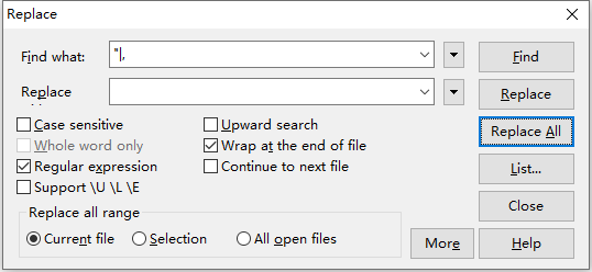 2、Ctrl+H将双引号,逗号 都替换为空字符串---> 即将双引号、逗号都删掉,使用【"|,】匹配