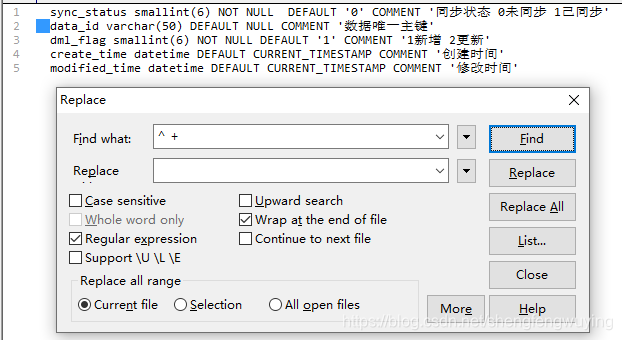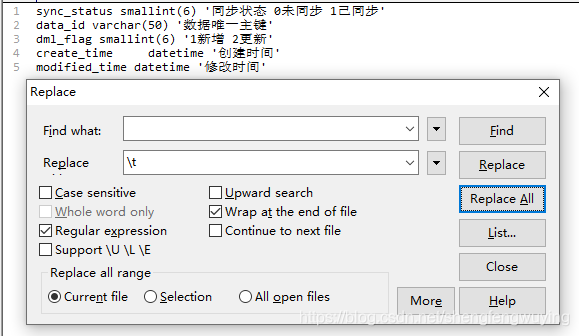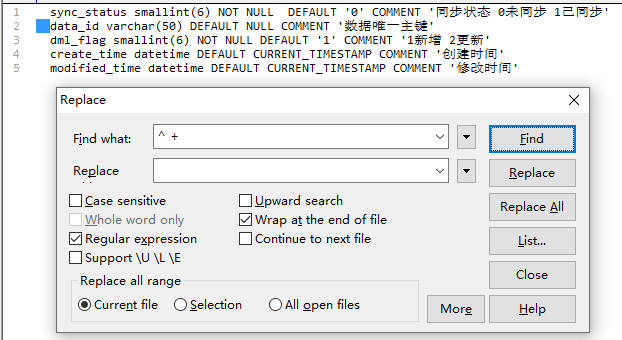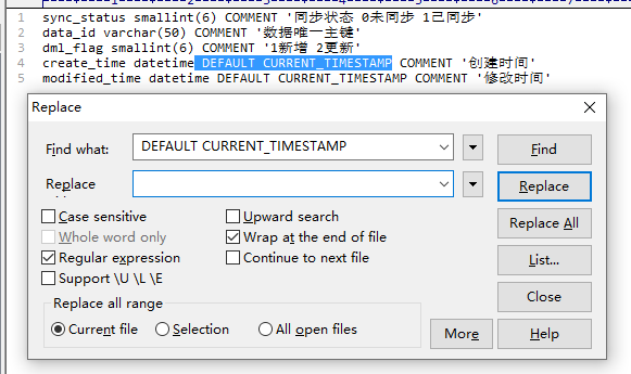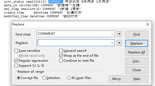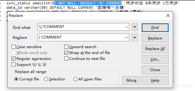 4、将字段类型和长度到COMMENT之间的部分删掉,使用【\).*COMMENT】匹配,替换为【) COMMENT】。