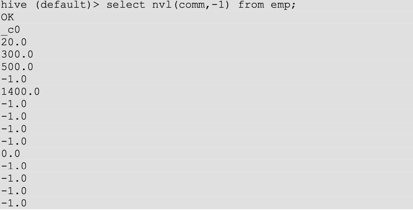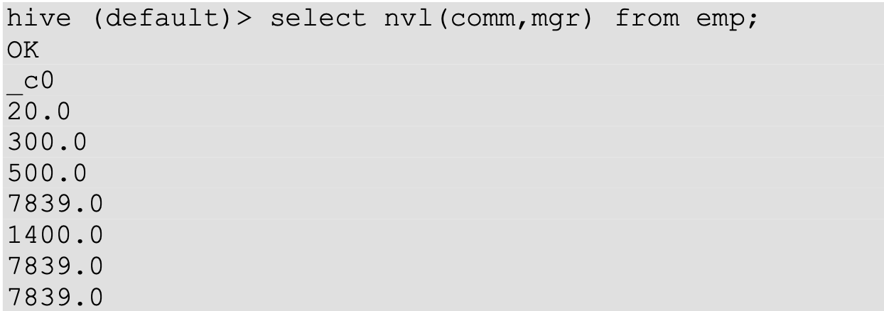 hive (default)> select * from emp where deptno not IN(30, 20);