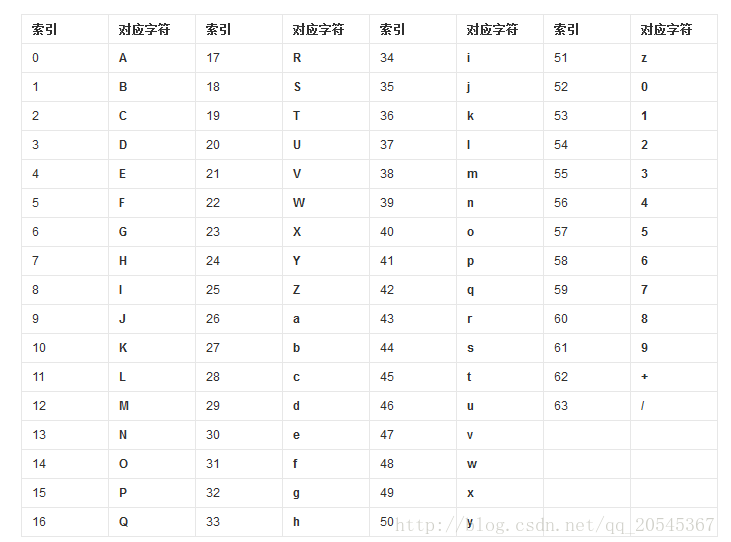 Base64,就是使用64个可打印字符来表示二进制数据的方法。Base64的索引与对应字符的关系如下表所示: