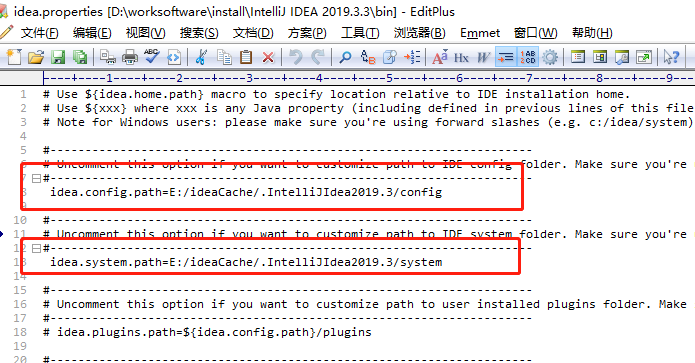 3、在IDEA安装目录的bin文件夹中找到idea.properties文件,修改以下配置,如果没有对应文件夹需创建