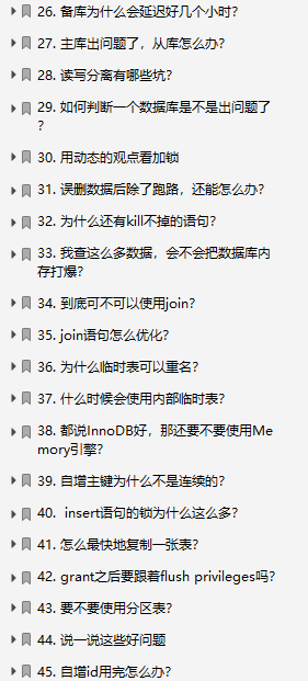 Tip:由于文章篇幅有限制,下面还有20个关于MySQL的问题,我都复盘整理成一份pdf文档了,后面的内容我就把剩下的问题的目录展示给大家看一下