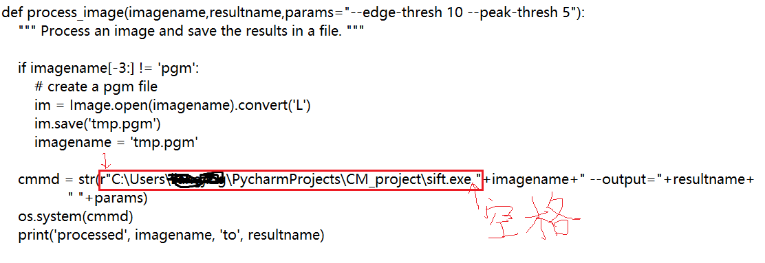 修改anaconda的安装目录下PCV下的文件:C:\Program Files\Anaconda3\Lib\site-packages\PCV\localdescriptors\sift.py,修改红框内的路径,改成自己的文件路径;注意红色箭头标记位置的书写;