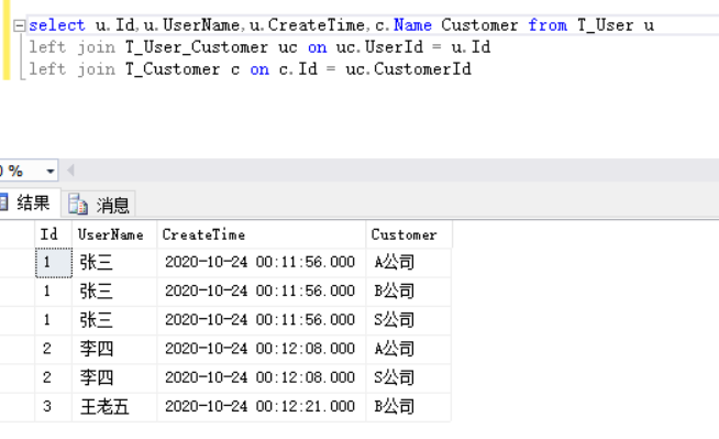 当我们利用left join把用户的客户拿过来的时候,因为张三是有三个客户的,对应就会有三条数据,如下图