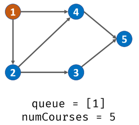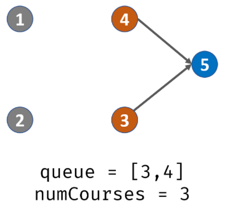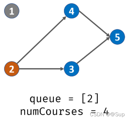 - 当入度 -1后邻接节点 cur 的入度为 0,说明 cur 所有的前驱节点已经被 “删除”,此时将 cur 入队。