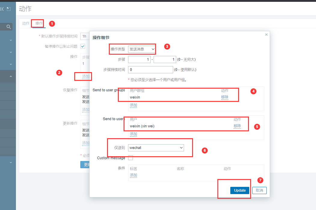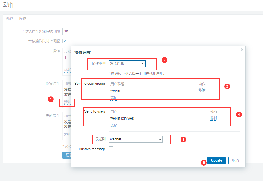 "touser":"xxxx", #企业号中的用户帐号,在zabbix用户Media中配置,如果配置不正常,将按部门发送