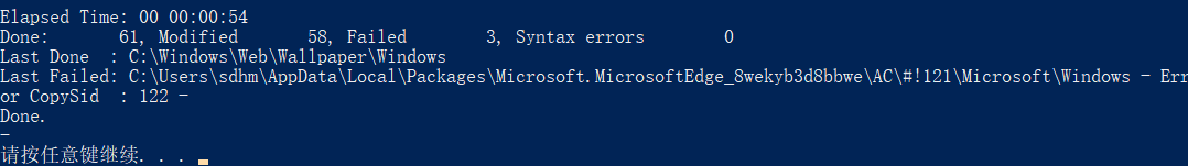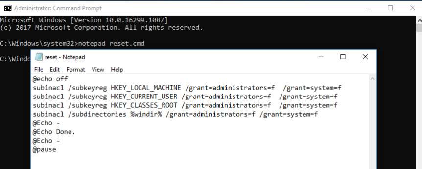 4、键入reset.cmd,调用运行subinacl程序,耐心等待,需运行很长时间,运行结束有以下提示:5