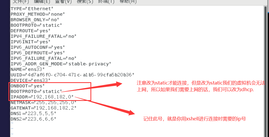 在我们的虚拟机上 执行命令操作vim /etc/sysconfig/network-scripts/ifcfg-ens33