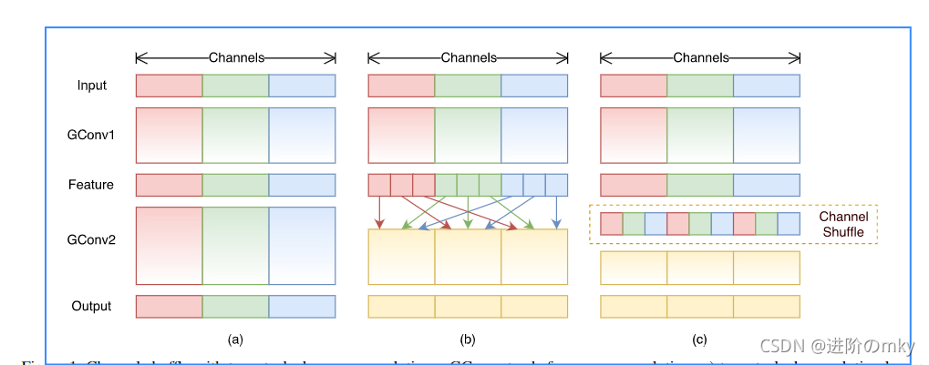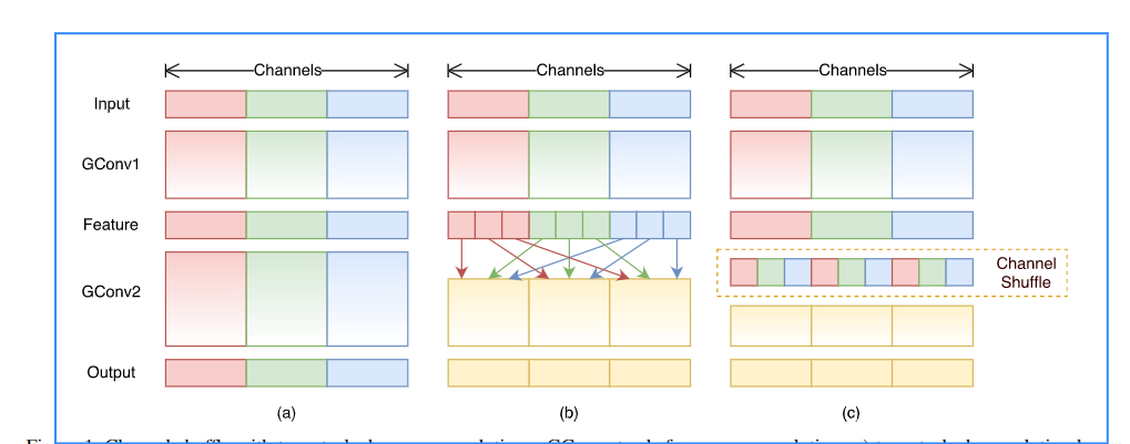 如上图(b)所示,将组卷积生成的结果继续在各个Group内划分小的子group,之后将每个Group内部对应位置处的子group拼接成新的Group,拼接后的结果如图(c)所示。