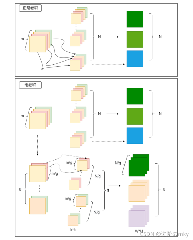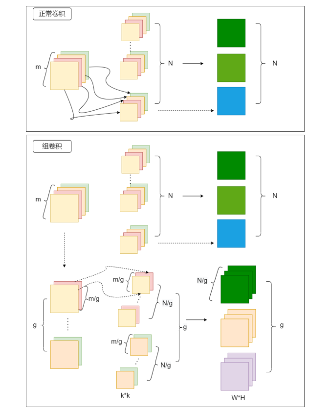Group Convolution早在AlexNet利用多GPU训练时被使用,之后ResNeX将中间3*3卷积采用组卷积的形式(这也是作者提出block的灵感吧,既然3*3利用了组卷积,为什么1*1的卷积核不使用呢)。组卷积是将输入channel分为多个group,同时将卷积核channel也进行分组,原理如下图所示。