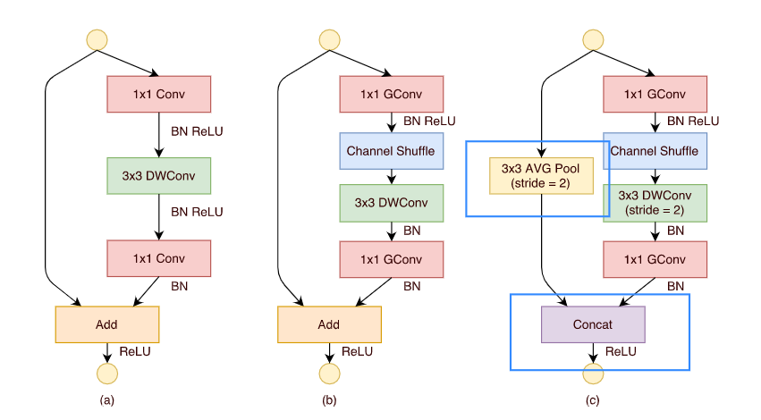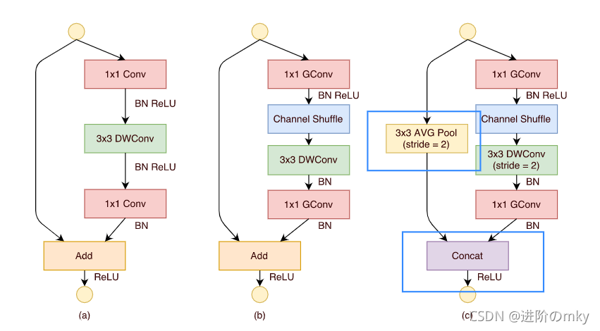 shuffleNet_v1的block相当于在残差结构上做了修改,图(a)是经典残差结构(将3*3卷积换成了dw卷积),图(b)和图(c)是ShuffleNet网络采用的block,当stride=1(图b)时候只是将1*1的卷积换成了组卷积(组卷积能减少计算量)并添加了Channel Shuffle部分;当stride=2(图c)时候,首先在shortcut部分采用了3*3的平均池化下采样,此外将输出通道的Add特征融合变成了Channel拼接。