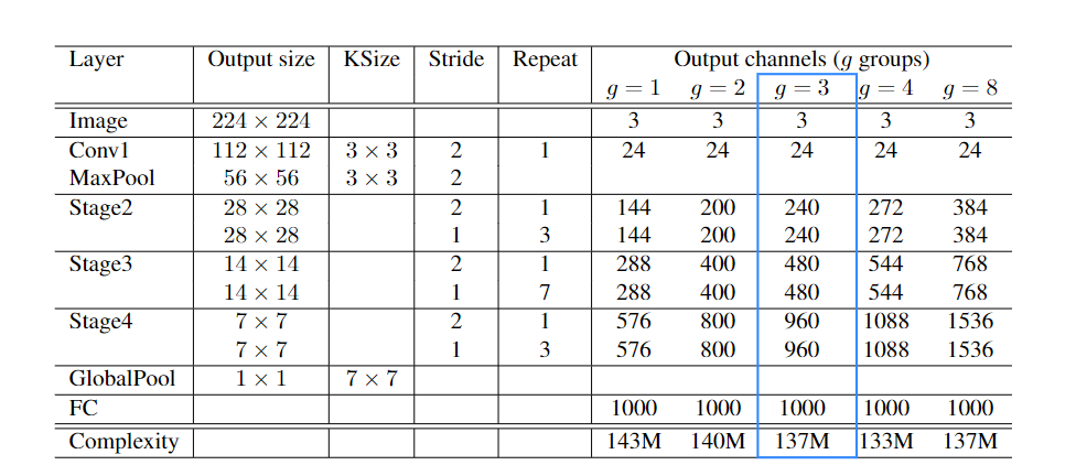 值得注意的是,当输入channel为24时候,由于输入channel太小,因此第一个1*1卷积并没有采用组卷积。