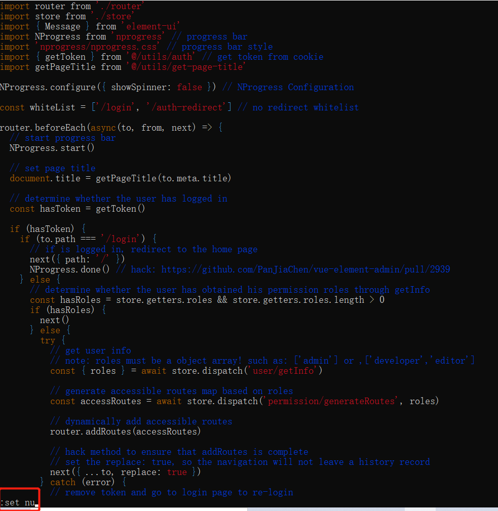 这个时候我们想确认某行代码在什么位置很不方便,只需要根据上面的提示在当期这个文件中执行:set number 或者 :set nu就可以显示行号了,这是临时的显示方法:
