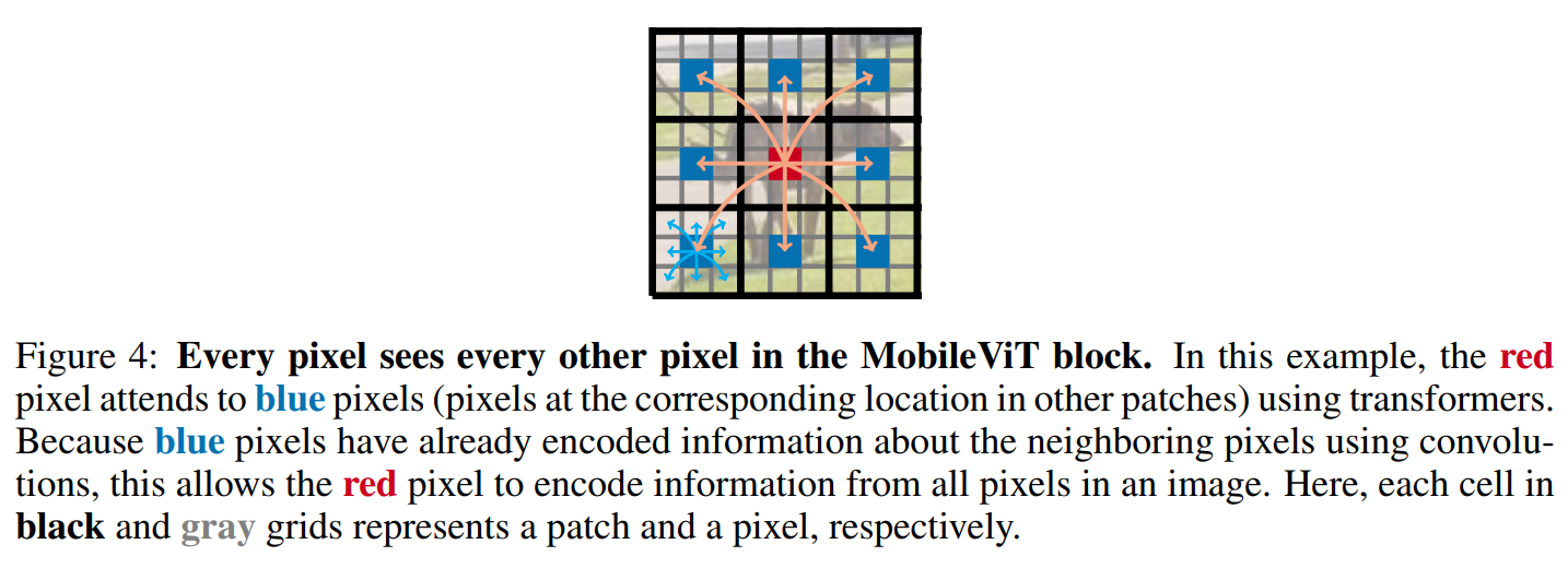 如图灰色表示每个像素,黑色表示每个patch。MobileViT block,可以实现通过红色像素加入到蓝色像素中,得到全局的特征,而每一个蓝色的像素已经基于cnn编码了其8邻域的像素。