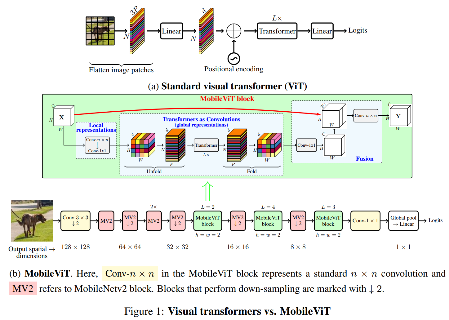 a表示传统的ViT设计结构,b表示本文提出的MobileViT,主要改进在于将MobileNetv2中的残差block替换为MobileViT block。