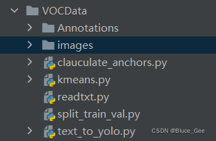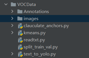 VOC格式数据集主要有两个文件夹,和一个文件,一个为存放图片的文件夹,另外一个为存放xml格式的标注文件夹,还有一个存放类别信息的txt文件,将官方GitHub下载到的yolov5源码使用pycharm打开,根目录下创建一个文件夹用来存放数据集,此处命名为VOCData,将图片文件和标注文件放入到该目录下,并将图片文件夹命名为images,标注文件夹命名为Annotation(注意:文件夹的名字一定不要有错,因为给出的代码中已经写好固定的文件夹名称,为了简便操作,文件夹的名称尽量与作者一致。),如图所示,创建几个py文件。