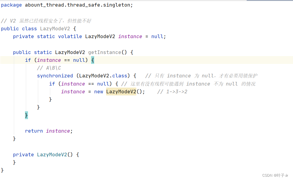 其懒汉模式实现如下:假如多个线程走先判断对象没有实例化,对类加锁(一个线程持有锁,但这是不知道是否实例化),所以要再判断是否实例化,没有实例化进行实例化,实例化了就返回对象,这里volatile就是要确保实例化正确。