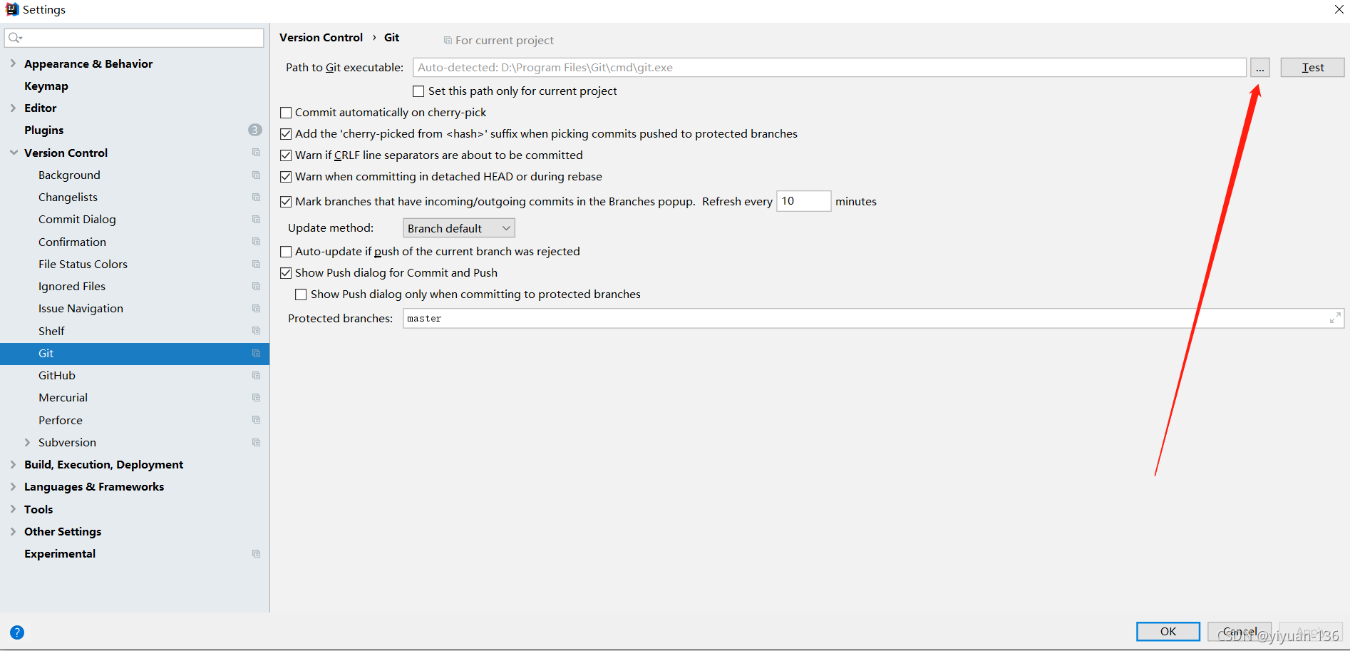 2、先选择Version Control,再点击Git,根据以下图片红色部分选择,把安装的git位置找到
